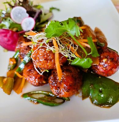 Deep fried vegetable balls or Cauliflower, dunked in sweet, sour & hot manchurian sauce a perfect Indo Chinese fusion.