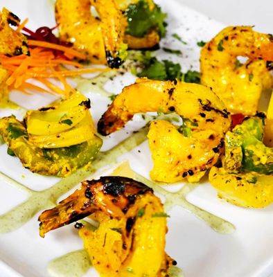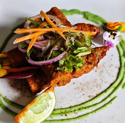 Barramundi fillet Or Prawns battered with Besan flour and north Indian spices served with mint sauce.