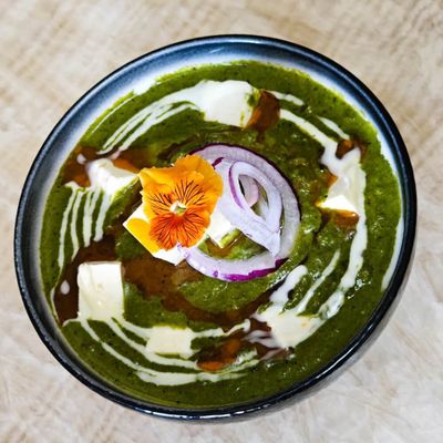 Homemade cottage cheese nestled in a smooth purée of baby spinach, gently spiced and finished with a splash of cream.