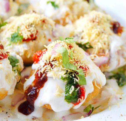Crispy chaat snack puffs filled with boiled potato and onions, yogurt, sweet tamarind chutney and green chutney. Sprinkled fresh chopped coriander, chaat masala and crushed sev.