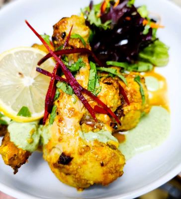 Tender chicken marinated in hung yoghurt, ginger, garlic, and a blend of warm spices. Roasted in the tandoor and served with cooling mint chutney.