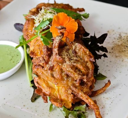 Deep fried savory snack made with chickpea flour, onion, fenugreek and north Indian spices served with mint and tamarind sauce.