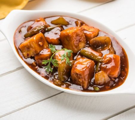 Melted cheese cubes stir-fried with chillies, capsicum, and soy sauce in a sizzling Indo-Chinese style—spicy and tangy