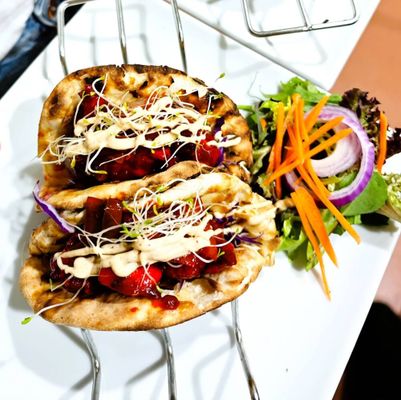 Tandoori naan taco topped with Sauteed chilli chicken, sliced onion and tomato mix.