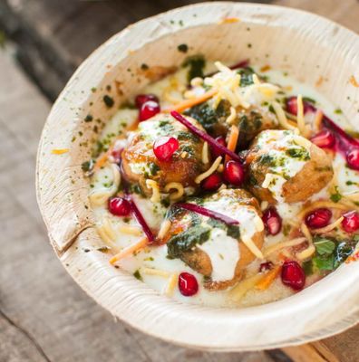 Deep fried fritters made with moong lentils. Served with boiled potatoes, flaky and deep fried crackers,yogurt, sweet tamarind chutney and green chutney. Sprinkled fresh chopped coriander, chaat masala.